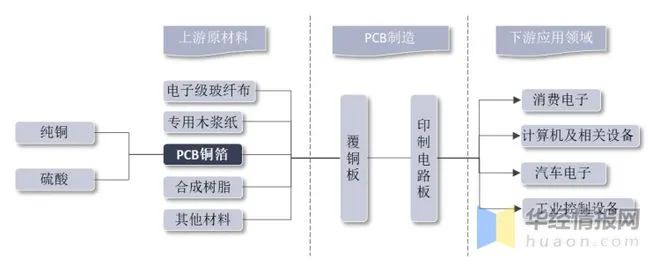 PCB銅箔與電子級玻纖布、專用木漿紙、合成樹脂及其他材料(如粘合劑、功能填料等)等原材料經(jīng)制備形成覆銅板,再經(jīng)過一系列其他復(fù)雜工藝形成印制電路板。印制電路板是電子互聯(lián)的基礎(chǔ),在電子整機產(chǎn)品中起到支撐、互連元器件的作用,被廣泛應(yīng)用于消費電子、計算機及相關(guān)設(shè)備、汽車電子和工業(yè)控制設(shè)備產(chǎn)品中。
