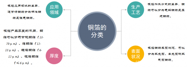 根據(jù)銅箔厚度的差異還可以將銅箔分為常規(guī)銅箔、薄銅箔、超薄銅箔、極薄銅箔。常規(guī)銅箔及薄銅箔主要應(yīng)用于PCB領(lǐng)域,超薄銅箔、極薄銅箔主要用于鋰電池領(lǐng)域;此外,根據(jù)銅箔表面的狀況還可以將銅箔分為雙光面、單光面、雙毛面銅箔。