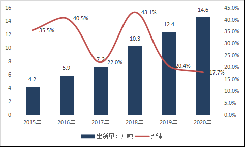 根據(jù)《中國銅箔行業(yè)發(fā)展白皮書(2021年)》數(shù)據(jù)顯示,2020年,中國鋰電銅箔出貨量達(dá)到14.6萬噸,同比增長17.7%。2015-2020年鋰電銅箔出貨量年均復(fù)合增速高達(dá)28.3%。